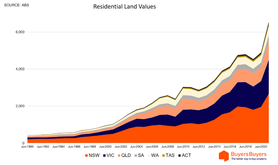 Figures from the Australian Bureau of Statistics showed that the estimated value of residential land in Australia has increased from $4.9tn to $6.6tn over the 2021 financial year.